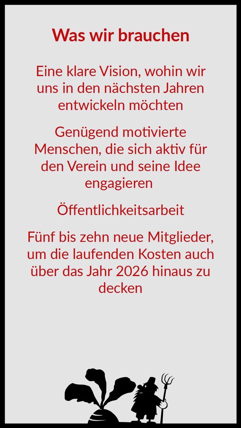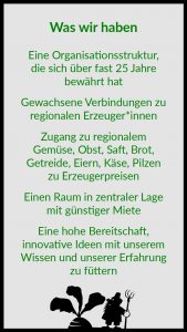 Aus aktuellem Anlass: Grünfutter besteht leider nur noch aus sehr wenigen Mitgliedern und wir können deshalb unsere laufenden Kosten und die anfallenden Aufgaben nicht mehr dauerhaft stemmen. Die Idee einer Erzeuger-Verbraucher-Gemeinschaft erscheint uns noch immer aktuell. Bei unserem nächsten Treffen am 04. März fragen wir uns – gerne mit neuen Gesichtern – ob und wie wir den Verein wieder stärker beleben können. Melde dich jetzt über gruenfutter [at] posteo.de wenn du mit uns den Verein und unseren Zugang zu regionalen Produkten zu Erzeugerpreisen erhalten möchtest! Und verbreite unseren Aufruf gerne weiter!